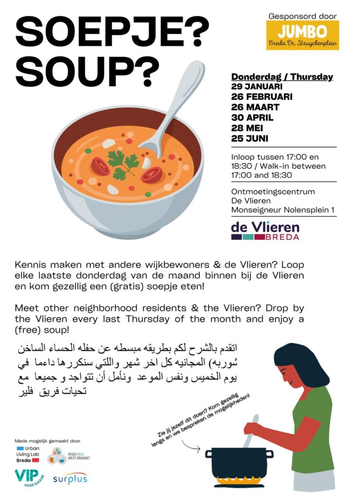 Elke laatste donderdag van de maand staat er een pan soep klaar bij Ontmoetingscentrum De Vlieren. Het Soepje is dé gelegenheid om op een laagdrempelige manier buurtbewoners te ontmoeten, samen te praten en natuurlijk te genieten van een warme kom soep.