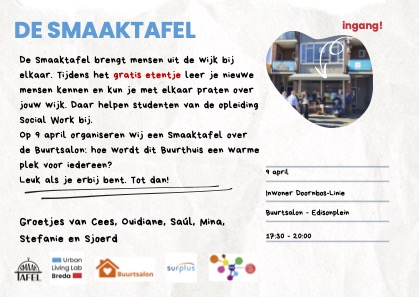 De Smaaktafel brengt mensen uit de wijk bij elkaar. Tijdens het gratis etentje leer je nieuwe mensen kennen en kun je met elkaar praten over jouw wijk. Daar helpen studenten van de Curio opleiding Social Work bij.