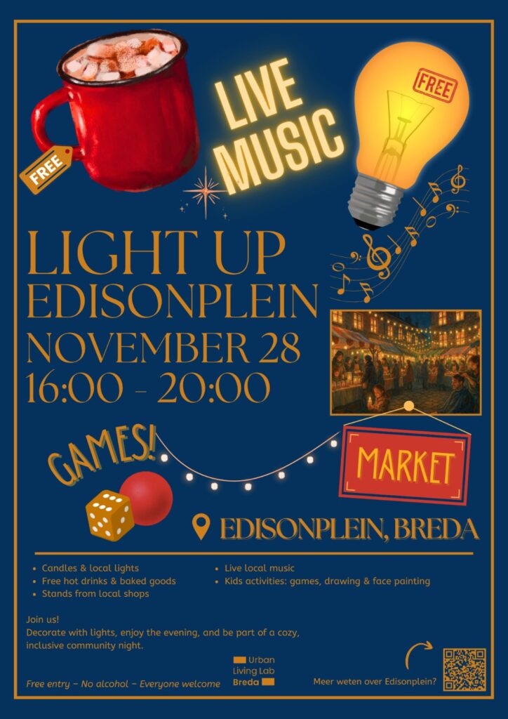 Zo is de verlichting op het plein al een lange tijd een hot topic. Het plein is donker en mensen voelen zich daardoor niet altijd veilig. Hoe mooi zou het zijn als het plein sfeervol verlicht wordt? BUas studenten Urban Placemaking en Inclusive Placemaking hebben dit als aanleiding genomen om een lichtfeest te organiseren in een van de donkerste maanden van het jaar. Samen met de ondernemers, de gemeente, Surplus en het stageteam van Urban Living Lab Breda organiseren zij op 28 november Light Up Edisonplein. CURIO studenten maatschappelijke zorg vullen het team vanaf november aan.