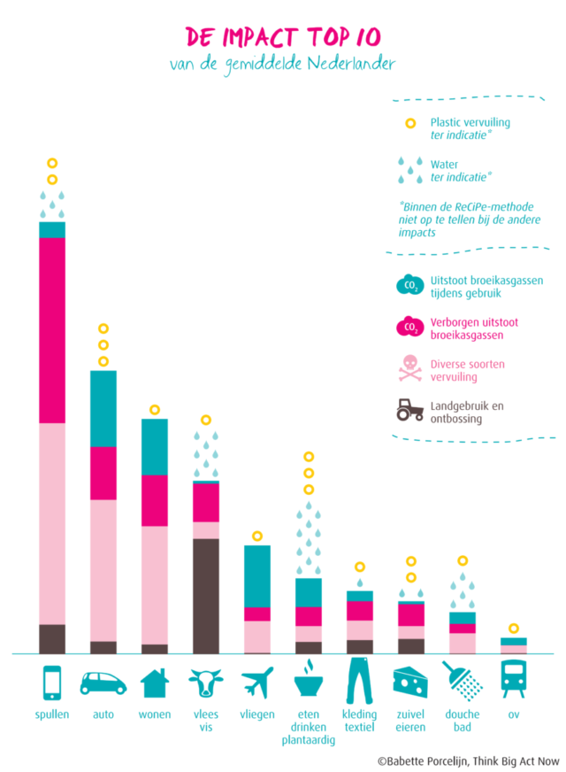 Porcelijn onderzocht wat de grootste impactbronnen zijn in het leven van een gemiddelde Nederlander. Bovenaan staan spullen – met elektronica als grote boosdoener – gevolgd door auto’s, woningen en vleesconsumptie. Om te weten waar je zelf vooral een positief verschil kunt maken elders op de wereld, ontwikkelde ze de My Hidden Impact meter. Door je eigen woonsituatie, voeding, en consumptiegedrag in te vullen, zie je duidelijk waar je de meeste impact maakt en dus ook waar je verschil kunt maken, is het idee.